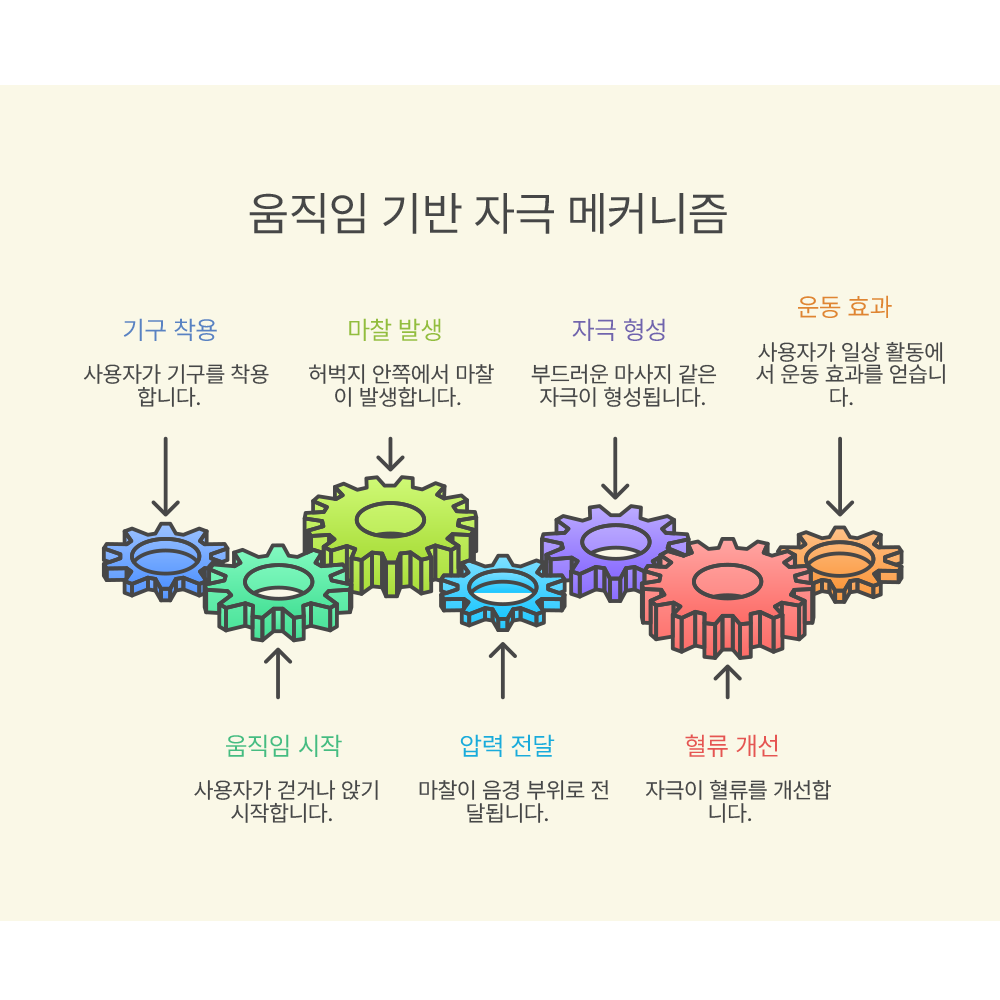 기구는 단순히 실리콘 몸체로 구성된 것이 아니라, 움직임에 반응하는 압력 전달 구조를 갖추고 있습니다. 걷거나 앉는 동안 허벅지 안쪽에서 발생하는 마찰이 음경 부위에 전달되면서 마치 부드럽게 마사지되듯한 자극을 형성합니다. 이 자극은 날카롭거나 날카로운 자극이 아닌, 반복되고 일정한 물리 자극으로 피부를 자연스럽게 자극하면서 효과적인 혈류 흐름을 유도합니다.